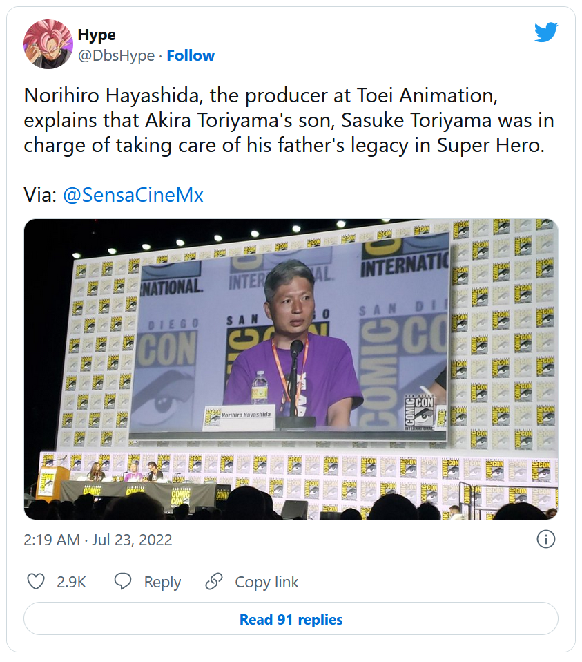 Norihiro Hayashida, le producteur de Toei Animation, explique que le fils d'Akira Toriyama, Sasuke Toriyama, était chargé de s'occuper de l'héritage de son père dans Dragon Ball Super Hero.