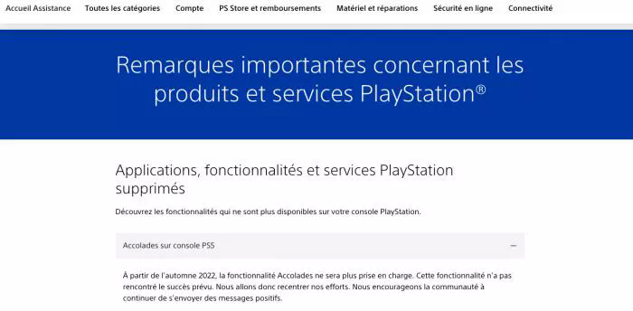 L'information a été annoncée sur le site officiel PlayStation, où Sony annonce que : "À partir de l'automne 2022, la fonctionnalité Accolades ne sera plus prise en charge. Cette fonctionnalité n'a pas rencontré le succès prévu. Nous allons donc recentrer nos efforts. Nous encourageons la communauté à continuer de s'envoyer des messages positifs."