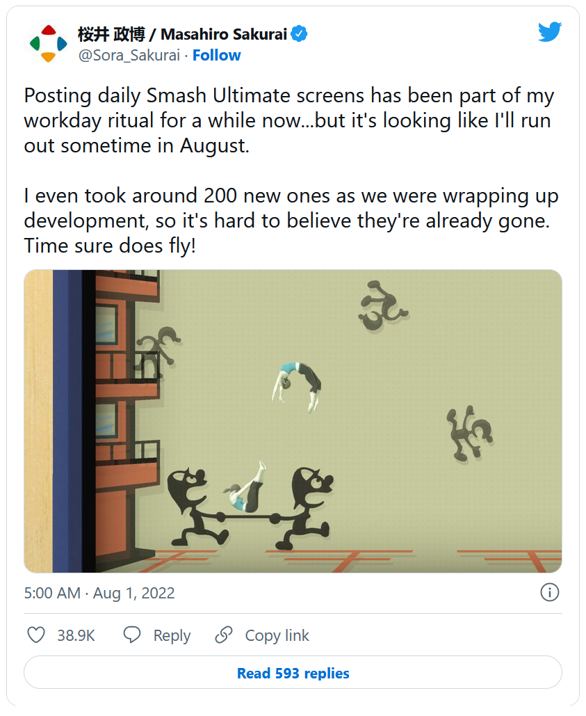 Dans une publication partagée hier sur Twitter, Sakurai a déclaré qu'il était presque à court de captures d'écrans de Super Smash Bros. Ultimate à partager avec les fans, regrettant ainsi de devoir mettre un terme à cette "part de son travail", devenue un rituel qu'il appréciait tout autant que les fans. Retrouvez ci-dessous la publication de Masahiro Sakurai :