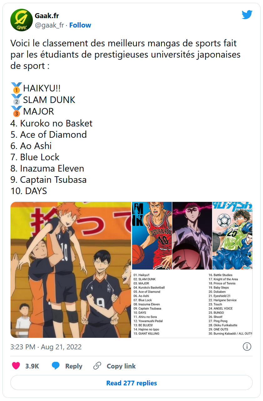 On remarque que si Slam Dunk est également présent dans ce Big 3 (qui est l'un des grands responsables de la popularisation du basket-ball au Japon), c'est Haikyu!! qui s'empare de la première place. Un manga qui ne traite pas de football, de basket-ball, de boxe, ou même de baseball, mais de volley-ball.