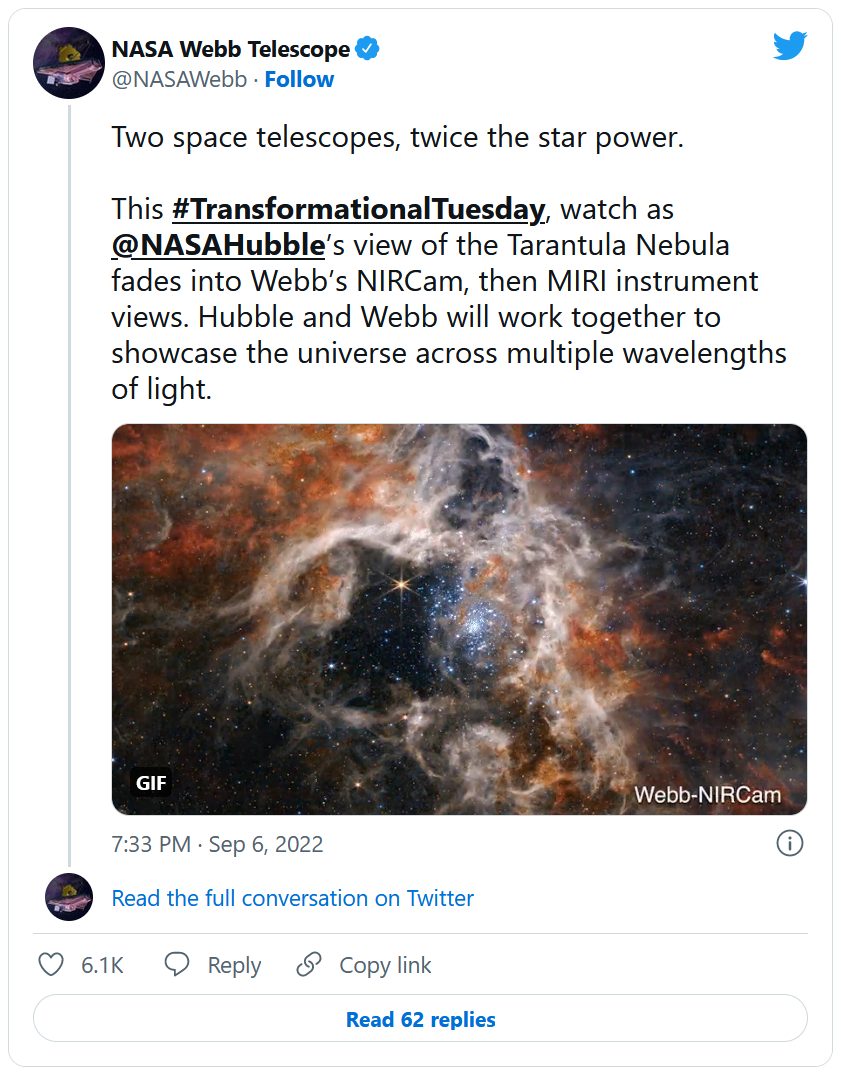 Cette nébuleuse de la Tarentule avait déjà été photographiée il y a des années de cela par le télescope Hubble, mais le niveau de détails du cliché fourni par James Webb (pris grâce à l'instrument NIRCam qui opère dans le domaine de l'infrarouge proche) se montre bien plus impressionnant, permettant notamment d'observer des milliers d'étoiles jusque-là invisibles à nos yeux et réparties sur une zone d'environ 340 années-lumières. Pour mieux saisir les progrès qui ont été fait, la NASA a publié un comparatif sur Twitter.