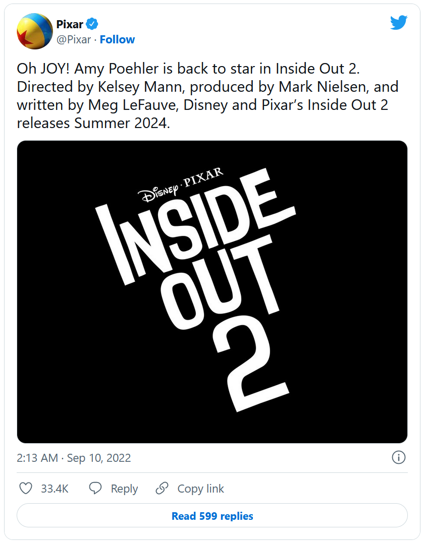 En effet, c'est lors de son panel qui se tenait à la D23 Expo 2022 que Pixar a officialisé une suite pour l'un de ses films. Le studio a créé la surprise car Pixar avait pris la décision de ne plus produire de suites à ces films après la sortie de Toy Story 4. Le studio à la lampe souhaitait désormais se concentrer sur des projets originaux. Mais il faut dire que le Covid est passé par là entraînant une diffusion directe de Soul, Luca et Alerte Rouge sur Disney+. Ajoutez à cela l'échec de Buzz l'Éclair au box-office ... Pixar se retrouve dans une situation délicate.
