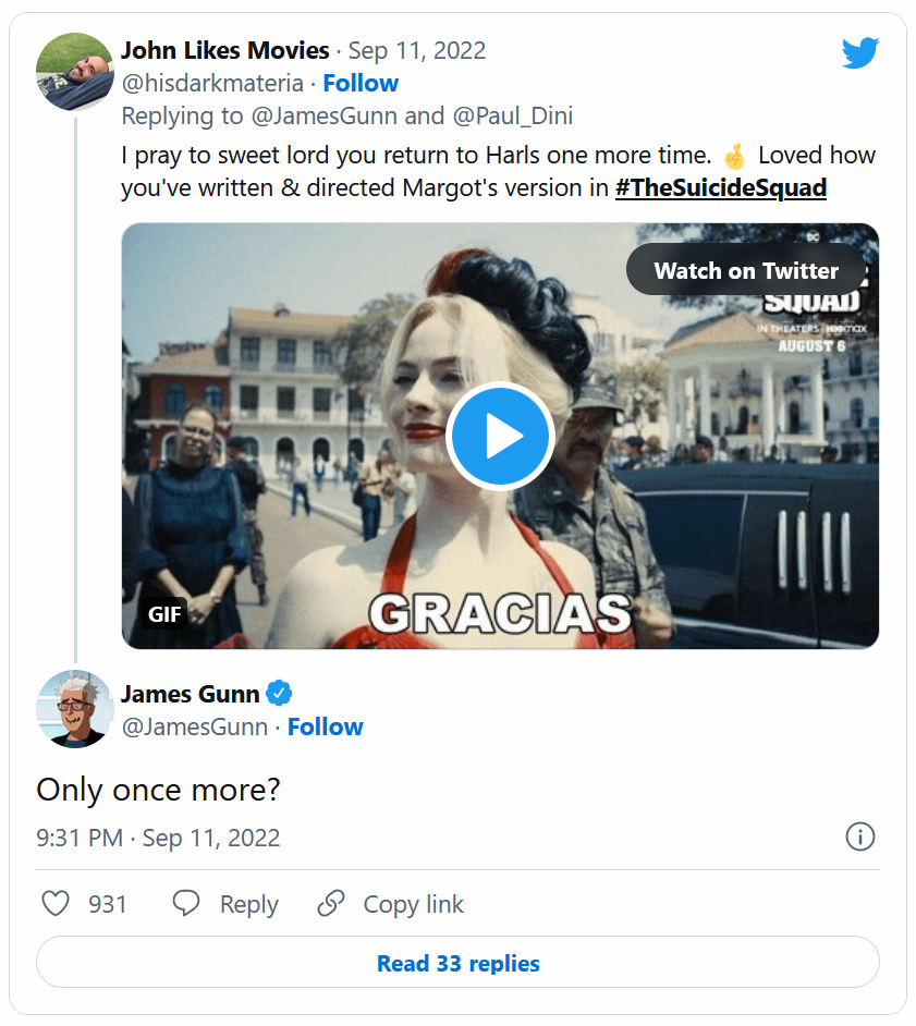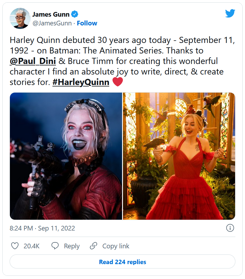 Pour fêter les 30 ans d'Harley Quinn, le cinéaste James Gunn s'est rendu sur son compte Twitter pour partager un petit hommage au personnage de Paul Dini et Bruce Timm. Forcément, de nombreux fans lui ont demandé si Margot Robbie allait revenir dans la peau de la psychopathe. Sa réponse est on ne peut plus claire, bien que très restreinte : "oui". Un internaute précise ensuite qu'il serait ravi de la revoir une nouvelle fois au cinéma. Ce à quoi James Gunn répond : "Seulement une seule fois ?"