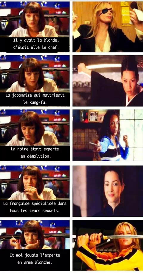Autre référence, plus connue cette fois. Lorsque Mia (Uma Thurman) et Vincent (John Travolta) dînent ensemble, la jeune femme, qui souhaite devenir actrice, évoque un casting qu'elle a récemment passé. Elle raconte que le récit était centré sur des femmes agents secrets appelées Fox Force 5. Elle précise qu'il y avait une blonde, une japonaise spécialisée dans le kung-fu, une fille noire experte en explosifs, une française très accro au sexe et qu'elle devait jouer la femme la plus dangereuse au monde avec un couteau. Ça ne vous rappelle rien ? Eh bien c'est le pitch de Kill Bill. Un film dans lequel Uma Thurman a tenu le rôle principal. Plus méta tu meurs.