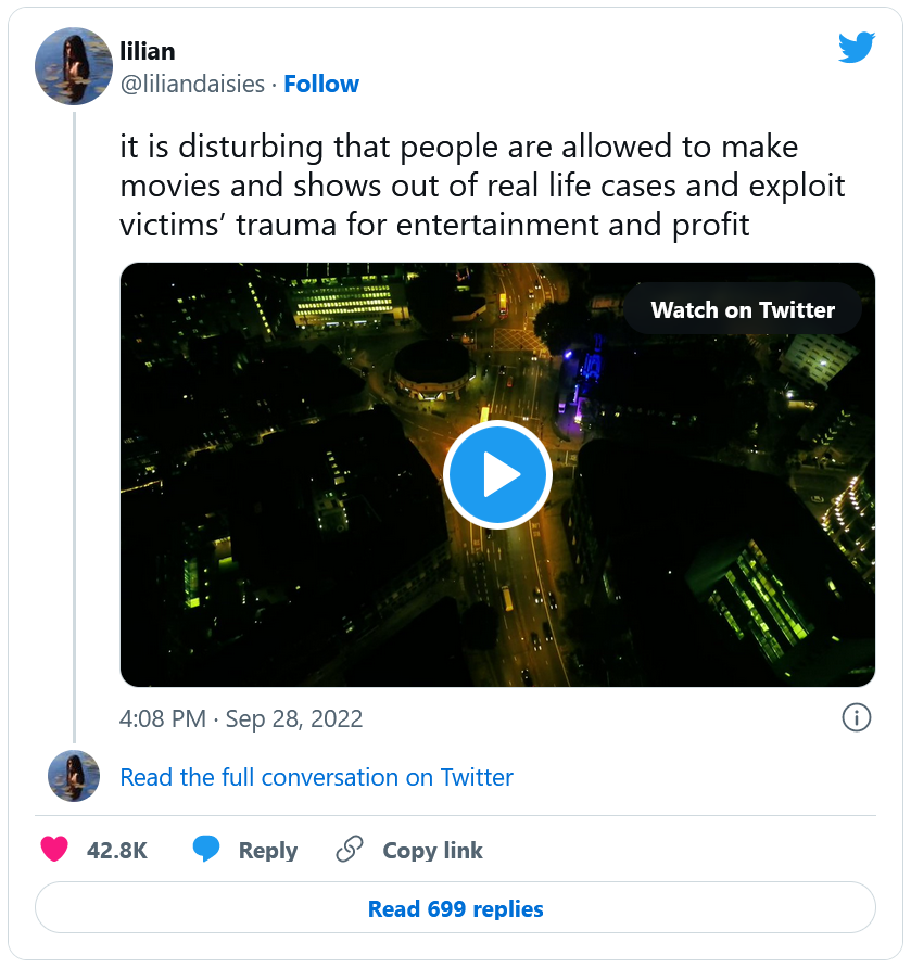 C'est dérangeant que les gens soient autorisés à faire des films et des séries inspirées d'affaires réelles et en exploitant les traumatismes pour le divertissement et le profit.