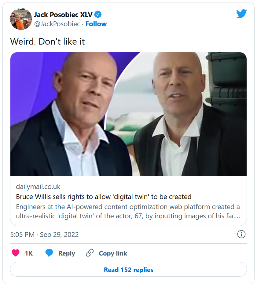 Mine de rien, c'est une grande première pour une star hollywoodienne, puisqu'avant lui, aucun de ses confrères ou consoeurs n'avait fait cette démarche, qui pose des questions d'ordres éthiques et morales. En effet, la société pourra s'associer à n'importe quel studio hollywoodien pour que Bruce Willis revienne à l'écran, que ce soit de son vivant ou après sa mort, rajeuni ou pas.