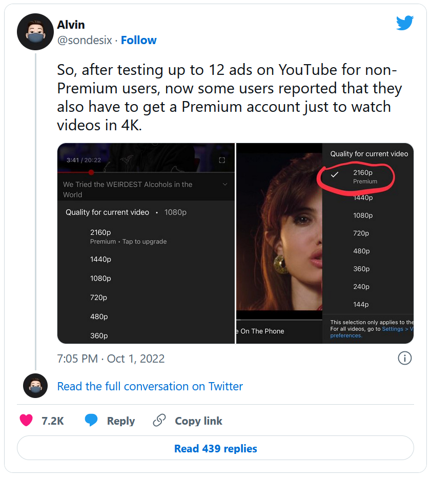 Donc, après avoir testé jusqu'à 12 publicités sur YouTube pour les utilisateurs non-Premium, certains utilisateurs signalent maintenant qu'ils doivent également obtenir un compte Premium juste pour regarder des vidéos en 4K.