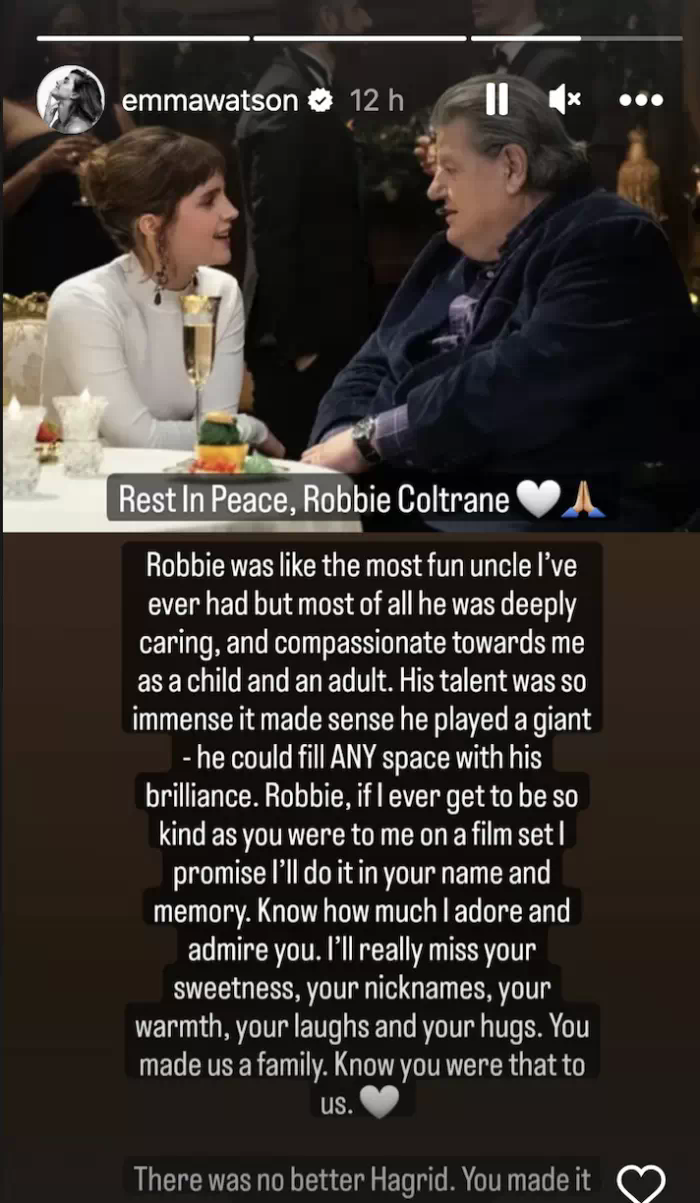 Robbie était comme l'oncle le plus amusant que j'aie jamais eu, mais surtout, il était profondément attentionné et compatissant envers moi en tant qu'enfant et adulte. Son talent était si immense qu'il était logique qu'il jouait un géant - il pouvait remplir N'IMPORTE QUEL espace avec son génie. Robbie, si jamais j'arrive à être aussi gentille que tu l'as été avec moi sur un plateau de tournage, je promets que je le ferais en ton nom et en ta mémoire. Sache combien je t'adore et t'admire. Ta douceur, tes surnoms, ta chaleur, tes rires et tes câlins vont vraiment me manquer. Tu as fait de nous une famille. Sache que tu étais cela pour nous. Il n'y avait pas de meilleur Hagrid. Grâce à toi, c'était une joie d'être Hermione.