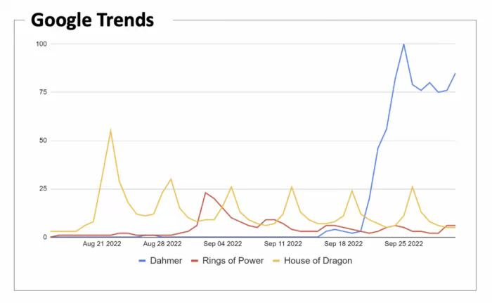 Un soulagement pour la plateforme qui atteint désormais son plus haut niveau d'abonnés de son histoire, avec 223 millions contre 221,4 millions précédemment. Un record qui laisse présager que le binge-watching a encore de beaux jours devant eux. Si les consommateurs restent chez Netflix, c'est avant tout pour son catalogue et surtout ses exclusivités. Alors que HBO Max et Prime Video peuvent compter sur House of the Dragon et Les Anneaux de Pouvoir, leurs séries événements respectives, pour générer de l'engouement, les tendances de Google confirment tout de même que l'intérêt autour de Dahmer, la série phare du moment de Netflix, est un cran au dessus.