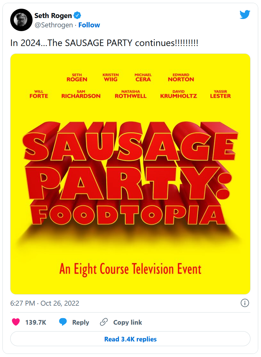Si certains considèrent parfois que les productions actuelles sont trop formatées, trop lisses, on ne devrait pas avoir trop de craintes concernant Sausage Party : Foodtopia. Dans un communiqué officiel, les deux co-scénaristes et showrunners Seth Rogen et Evan Goldberg s'amusent à teaser leur série comme un futur "chef-d'œuvre" qui devrait aller encore plus loin que le film original, et ce dans tous les domaines.