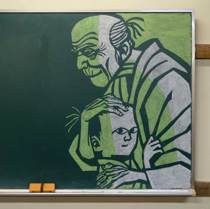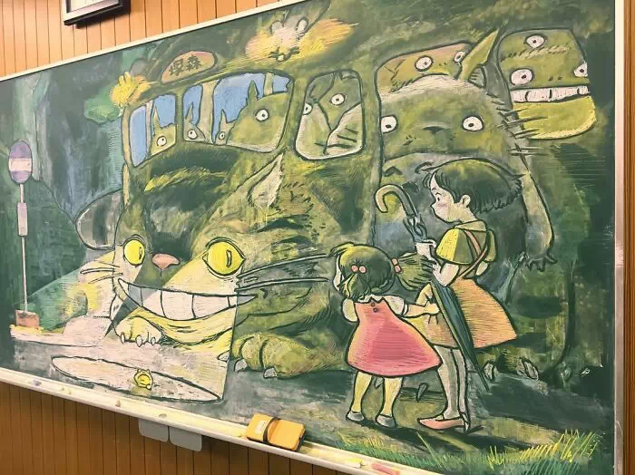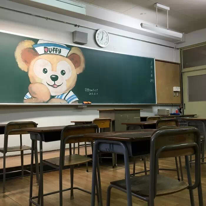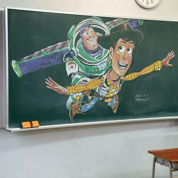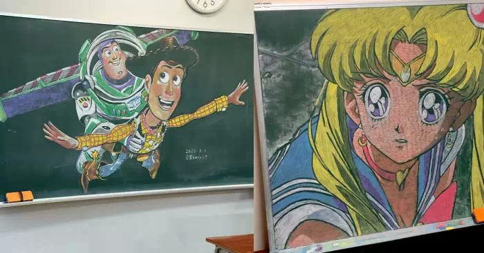 Le professeur d'art plastique et graphiste Hirotaka Hamasaki, qui travaille dans un lycée de la ville de Nara au Japon a décidé de faire une jolie surprise à ses élèves avant qu'ils ne rentrent en classe. Il reproduit des dessins animés à la craie sur son grand tableau noir et il faut reconnaitre que le résultat est vraiment splendide, on note aussi qu'il a beaucoup de patience pour arriver à un tel résultat. Il a décidé d'entreprendre cela pour apporter un peu de gaieté à ses élèves durant les cours. Il y a en pour tous les gouts de Pokémon à My Hero Academia en passant par Sailor Moon ou encore Toy Story, on vous laisse découvrir son travail.