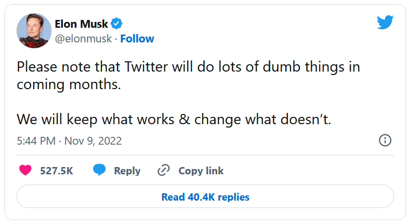 Plus tôt dans la semaine, Musk avait tenu à "prévenir" les utilisateurs de Twitter que la plateforme connaitrait probablement des hauts et des bas durant les prochains mois, suggérant ainsi que le réseau social et son nouveau propriétaire feront encore parler d'eux prochainement.