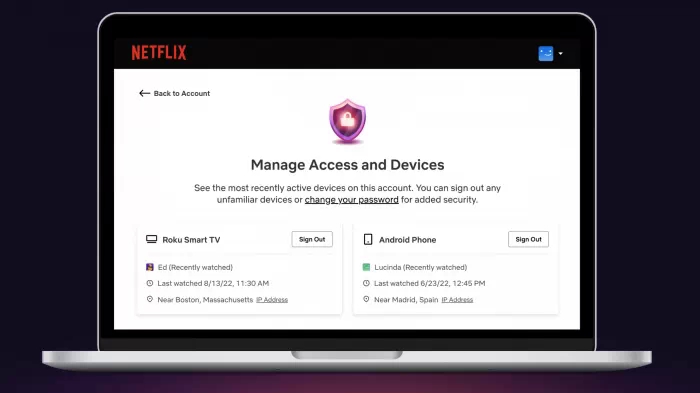 "Gérer les accès et les appareils", tel est le nom de la toute nouvelle fonctionnalité actuellement déployée par Netflix. Pour y accéder, il faut vous rendre dans l'onglet "Compte", puis dans "Sécurité et confidentialité". A partir de là, il vous est possible de "consulte[r] la liste des appareils les plus récemment actifs sur ce compte", en vérifiant de nombreuses informations : appareil utilisé, lieu de connexion, date, heure de la dernière utilisation et nom d'utilisateur sont ainsi indiqués noirs sur blanc. De quoi vérifier qui fait quoi et surtout si la personne qui squatte votre compte est une personne de confiance.