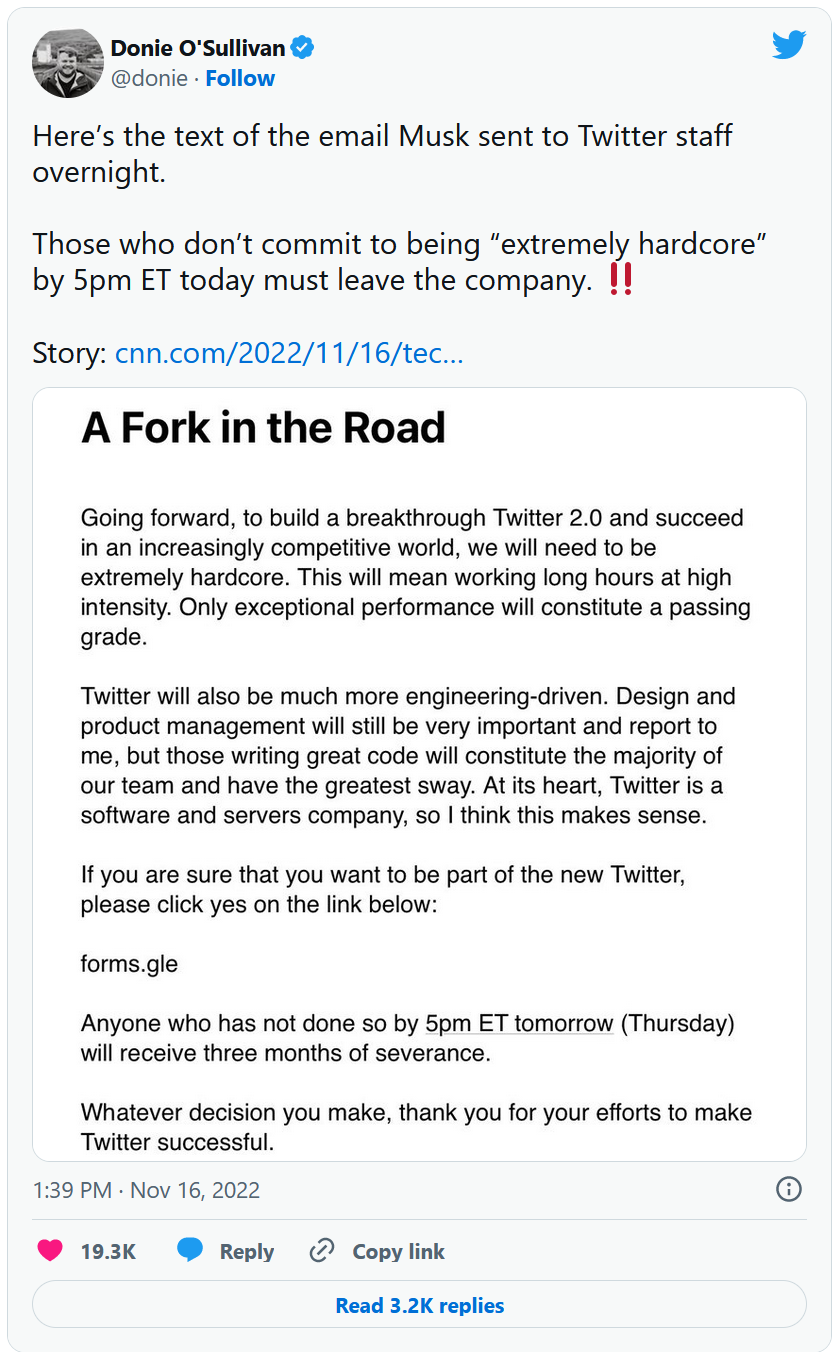À l'avenir, pour construire un Twitter 2.0 révolutionnaire et réussir dans un monde de plus en plus compétitif, nous devrons être extrêmement rigoureux. Cela signifie travailler de longues heures à une intensité élevée. Seules des performances exceptionnelles permettront d'obtenir la note de passage.