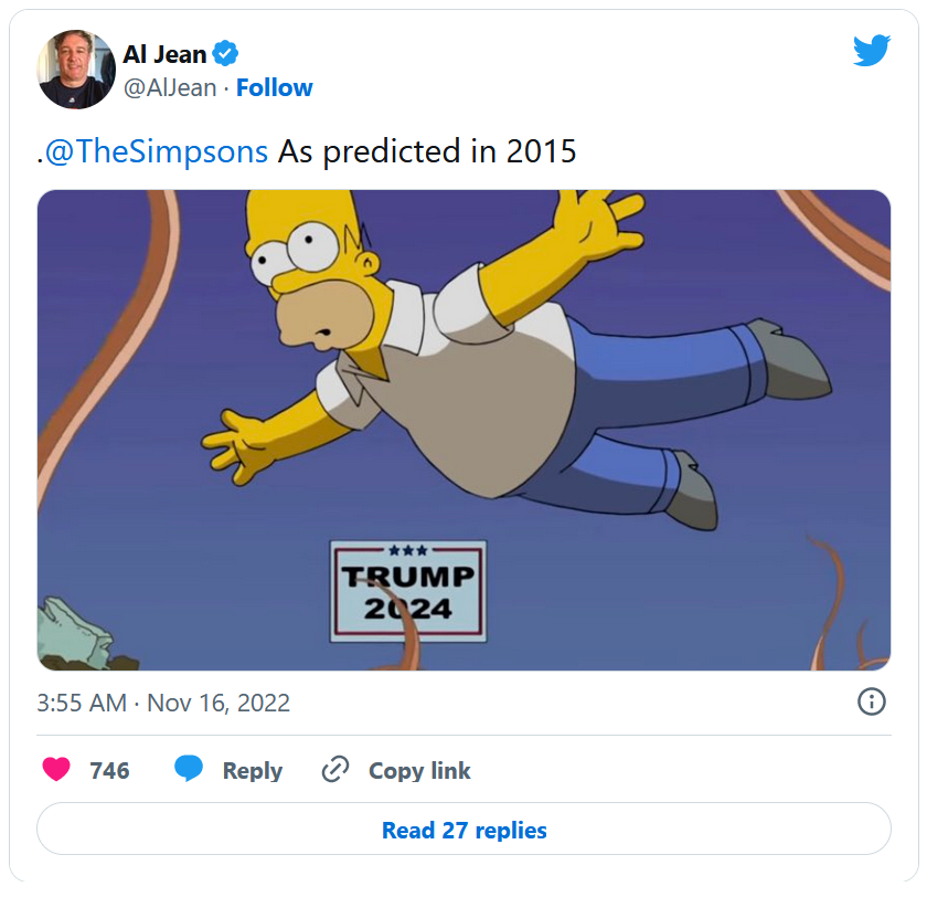 La série a sans doute un don, mais sa longévité joue en sa faveur. Récemment, l'ex président des Etats-Unis Donald Trump, locataire de la Maison Blanche de 2017 à 2021, a officialisé sa candidature aux futures élections de 2024. Surprise, les Simpson l'ont prédit dans un épisode de 2015. C'est le scénariste du show qui nous le rappelle via un tweet.