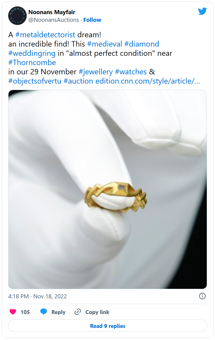 Il s'agissait précisément d'une bague médiévale faite d'or et de diamants, d'une valeur estimée à environ 46 000 euros. D'ailleurs, l'alliance sera très bientôt aux enchères grâce à la maison britannique Noonans Mayfair.