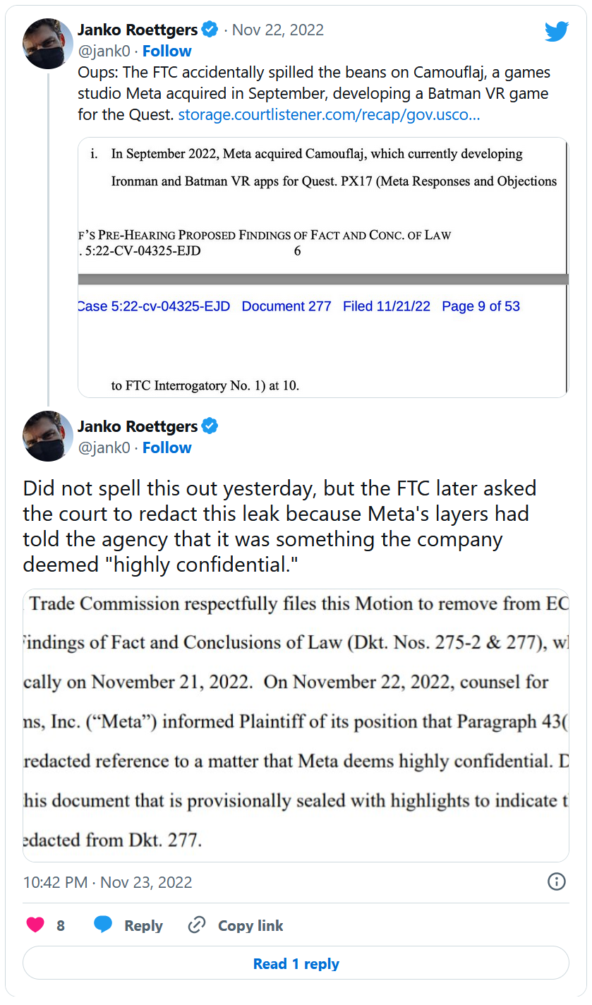 Je ne l'ai pas précisé hier, mais la FTC a ensuite demandé au tribunal d'expurger cette fuite parce que les couches de Meta avaient dit à l'agence que c'était quelque chose que la société considérait comme "hautement confidentiel".
