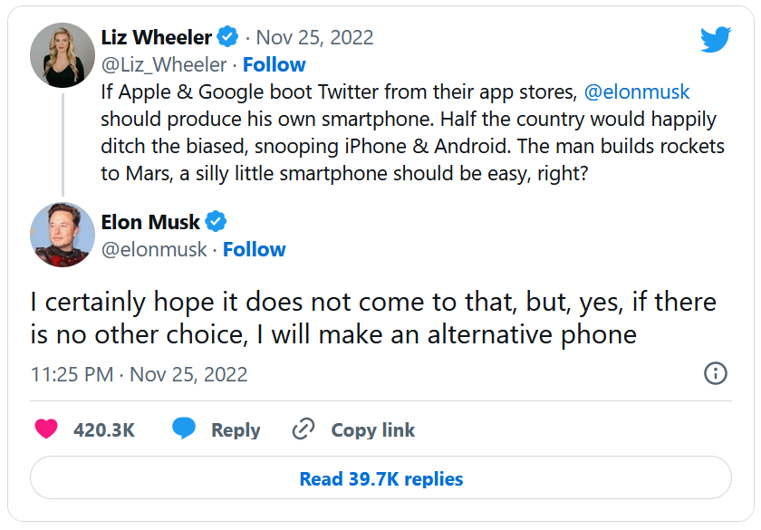 Il y a quelques jours, une podcasteuse américaine du nom de Liz Wheeler se questionnait au sujet de l'avenir de Twitter sur l'App Store et le Google Play. Sur Twitter, elle est-même allée jusqu'à s'imaginer qu'Elon Musk pourrait lancer son propre smartphone en cas d'éjection de l'application de ces stores. C'est à la surprise générale que le nouveau patron de Twitter a répondu que l'option était tout à fait envisageable.