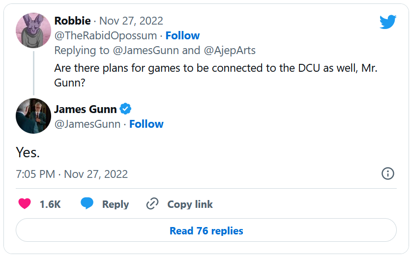 Lorsque James Gunn a été annoncé pour reprendre les rênes du DCEU, il n'y a eu aucune annonce d'un quelconque jeu vidéo. Alors, lorsqu'un internaute lui demande si les futurs titres vidéoludique seront intégrés à la timeline, le réalisateur répond.