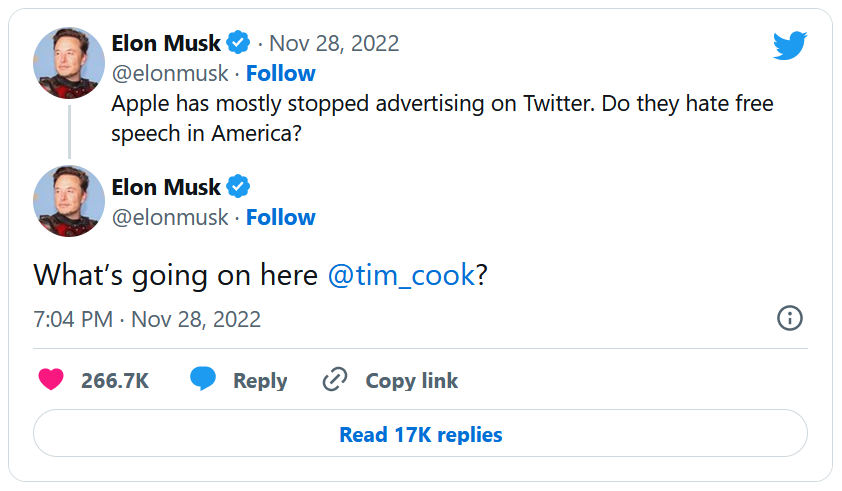 L'entrepreneur part en croisade contre le géant de la tech, et pas qu'à moitié. En effet, sur son réseau social, il va même jusqu'à interpeller Tim Cook sur les pratiques de la société. En premier lieu, Elon Musk critique la décision d'Apple d'avoir stoppé les campagnes publicitaires.