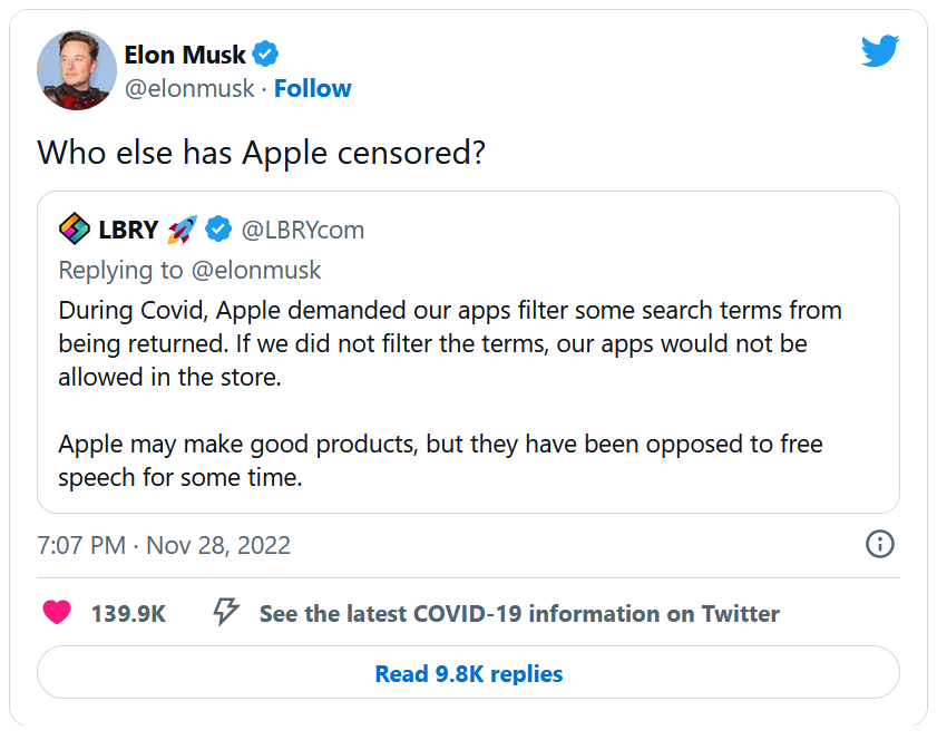 Il partage également des tweets d'entreprises allant dans son sens et qui accusent la société de censure. Apple était l'un des principaux annonceurs de la plateforme avec des dépenses allant jusqu'à 48 millions de dollars. Le problème, c'est que la publicité représente 90 % des revenus de l'entreprise. General Motors, Volkswagen, Chipotle et d'autres entreprises ont également mis en stand by leurs annonces publicitaires, ce qui est une catastrophe pour la société d'Elon Musk.