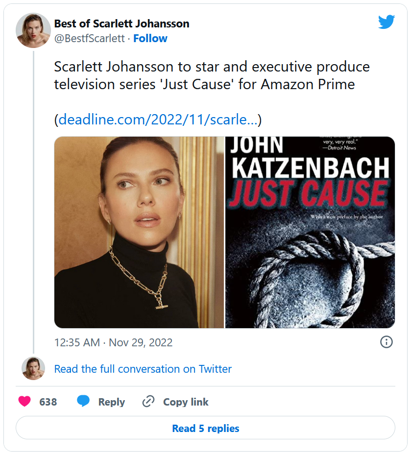 Déjà très reconnue en tant qu'actrice, réalisatrice ou encore productrice, Scarlett Johansson a vu sa popularité littéralement exploser à travers les films Avengers dans lesquels elle interprète Natacha Romanoff, que l'on retrouve également dans quelques autres films du MCU, dont l'un lui étant entièrement dédié. Mais ce personnage, c'est désormais de l'histoire ancienne. Aujourd'hui, Johansson se tourne vers de nouveaux horizons et plus particulièrement vers le merveilleux monde des séries. Cette fois-ci, direction Prime Video avec Just Cause, comme le révèle le média Deadline.