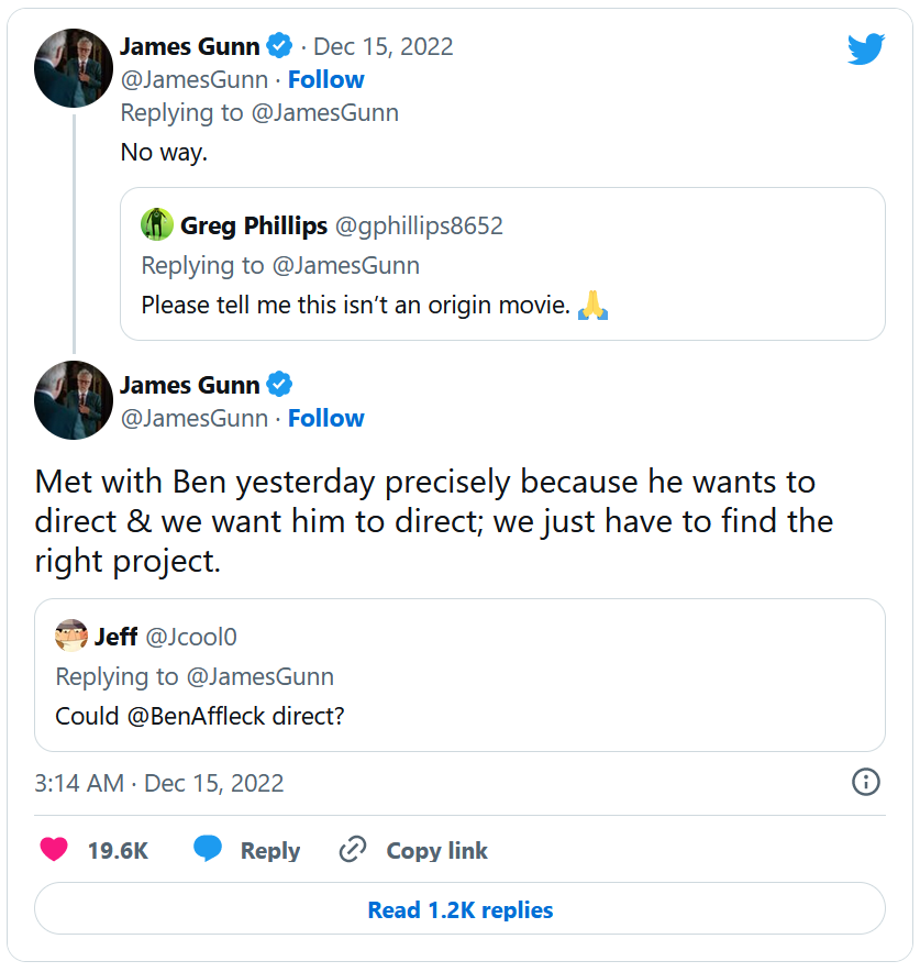 James Gunn est un homme plein de surprises. Après avoir annoncé le départ d'Henry Cavill, qui était officiellement de retour en Clark Kent depuis son caméo à la fin de Black Adam, le voilà qui tease le come back d'un autre acteur. En effet, le cinéaste a posté ce jeudi 15 décembre une série de tweets au sujet du DCEU, et l'un d'entre eux concerne nul autre que Ben Affleck ! Sur les réseaux sociaux, James Gunn a annoncé avoir pris contact avec l'interprète de Batman non pas pour incarner le super-héros, mais pour réaliser un futur film de la franchise.