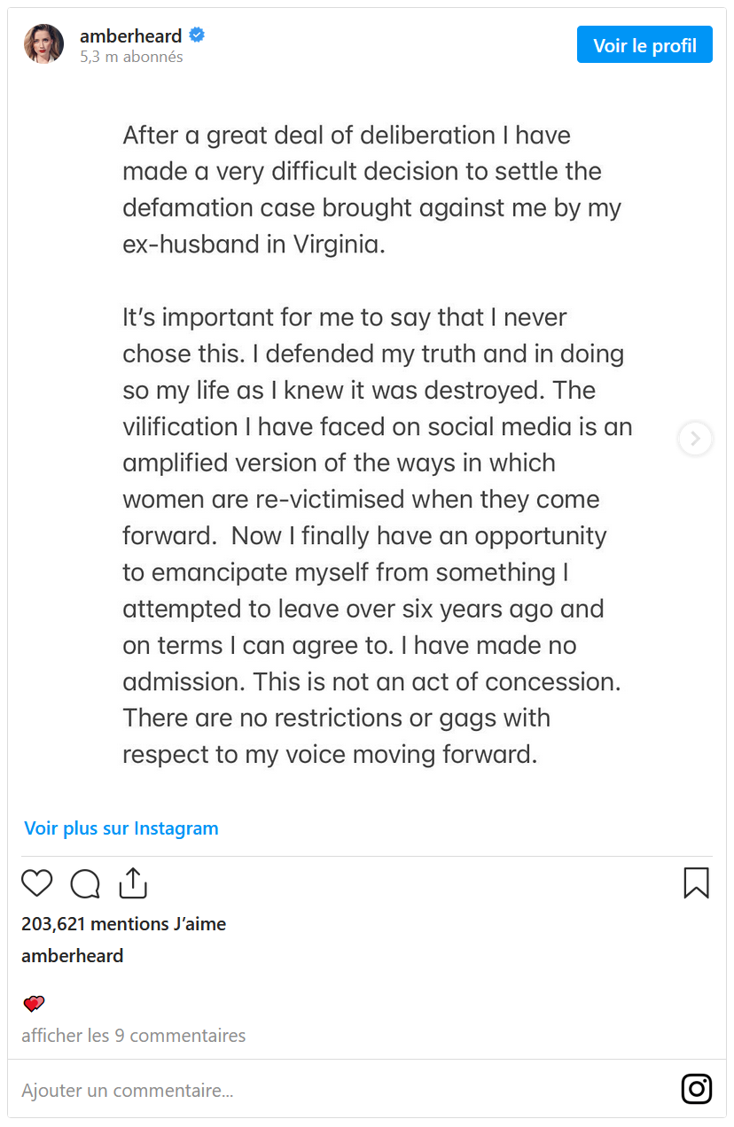 Nouveau rebondissement, et sans doute le dernier, puisque via un long post Instagram, elle annonce avoir trouvé un accord avec l'adversaire et renonce donc à faire appel.
