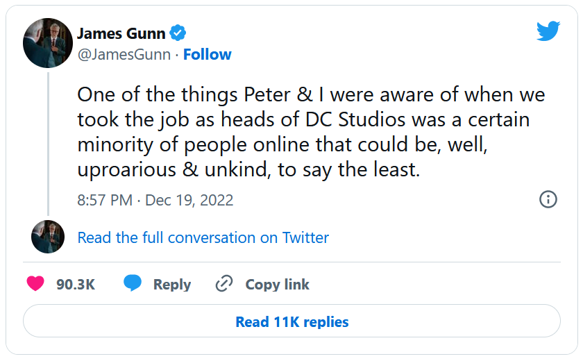 L'une des choses dont Peter et moi étions conscients lorsque nous avons pris le poste à la tête de DC Studios était qu'une certaine minorité de personnes en ligne pouvait être bruyante et méchante, c'est le moins qu'on puisse dire.