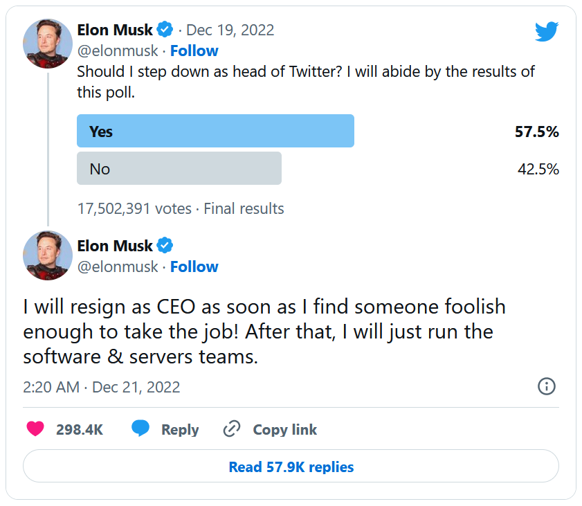 Ainsi, face à ses détracteurs et suite aux nombreuses polémiques, Musk a souhaité sonder les utilisateurs de la plateforme pour connaître leur avis quant à son maintien à la tête de Twitter. Il a donc lancé un sondage sur son compte le 19 décembre dernier pour savoir s'il devait quitter la tête de l'entreprise.