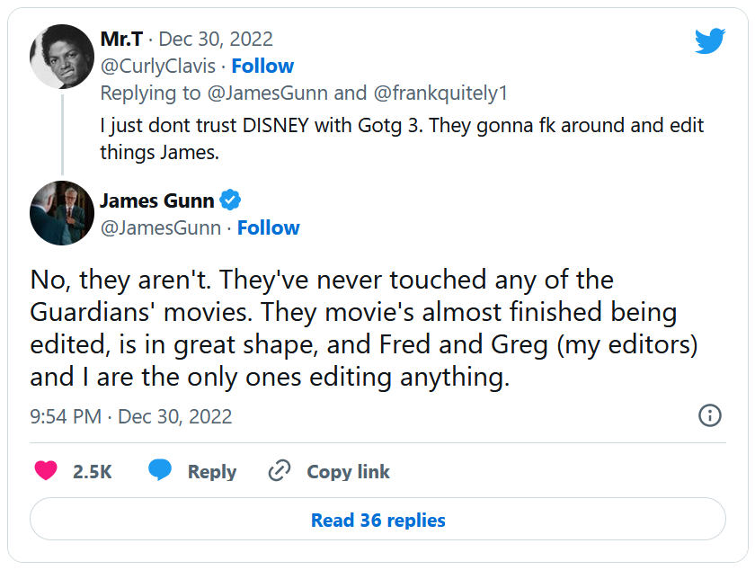 Les Gardiens de la Galaxie 3 verra le grand retour de Star-Lord, Gamora, Drax le Destructeur, Nébula, Mantis, Groot et Rocket après les événements survenus dans Avengers Endgame et Thor love & Thunder. Ces super-héros qui se sont jurés de défendre le cosmos des périls qui le menacent vont devoir affronter Ayesha, la prêtresse des Souverains, et son héraut, Adam Warlock. Mais ce n'est pas tout, car le créateur de Rocket, le Maître de l'évolution, veut lui remettre la main dessus ! Comme vous le voyez, ces nouvelles aventures de la team vont être mouvementées... Et les fans espèrent que la vision du cinéaste aux commandes de la trilogie, James Gunn, pourra s'exprimer pleinement, sans interférence de Disney. Une des pires craintes du public est que les studios interviennent dans l'aspect créatif du film et gâchent l'histoire, comme vous pouvez le voir ci-dessus. Une peur que le réalisateur a tenu à apaiser !