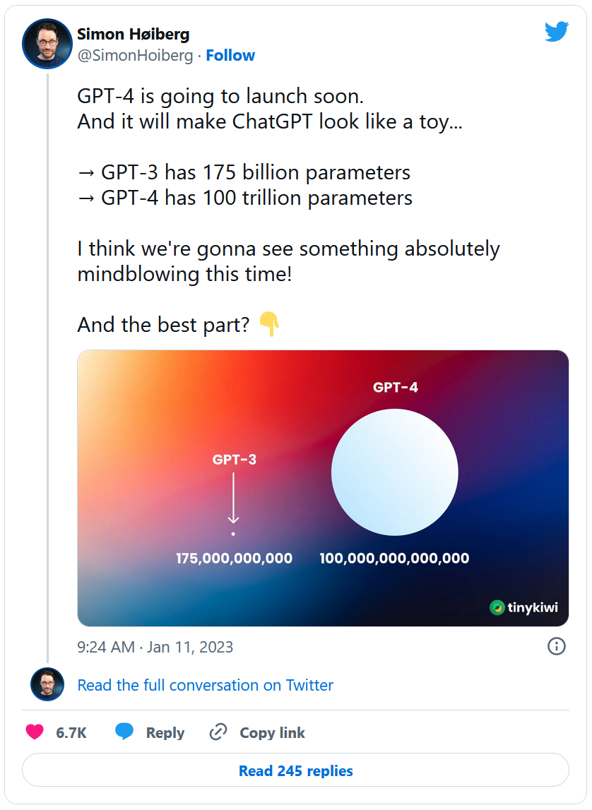 En effet, l'entreprise américaine est en train de mettre au point GPT-4, qui permettra à ChatGPT de tourner avec 100 000 milliards de paramètres, quand l'actuelle version, GPT-3,5, apporte des réponses via 175 milliards de paramètres. Le chatbot sera donc en mesure d'apporter des réponses immensément plus développées et plus précises qu'aujourd'hui et d'apporter des aides révolutionnaires à quiconque. Ces chiffres impressionnants proviennent du développeur via un tweet sur le réseau social à l'oiseau bleu.