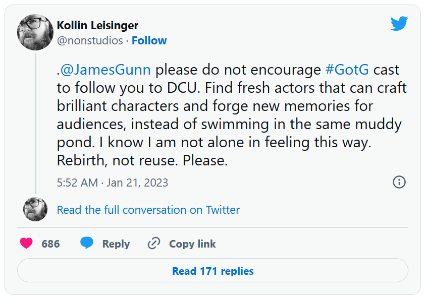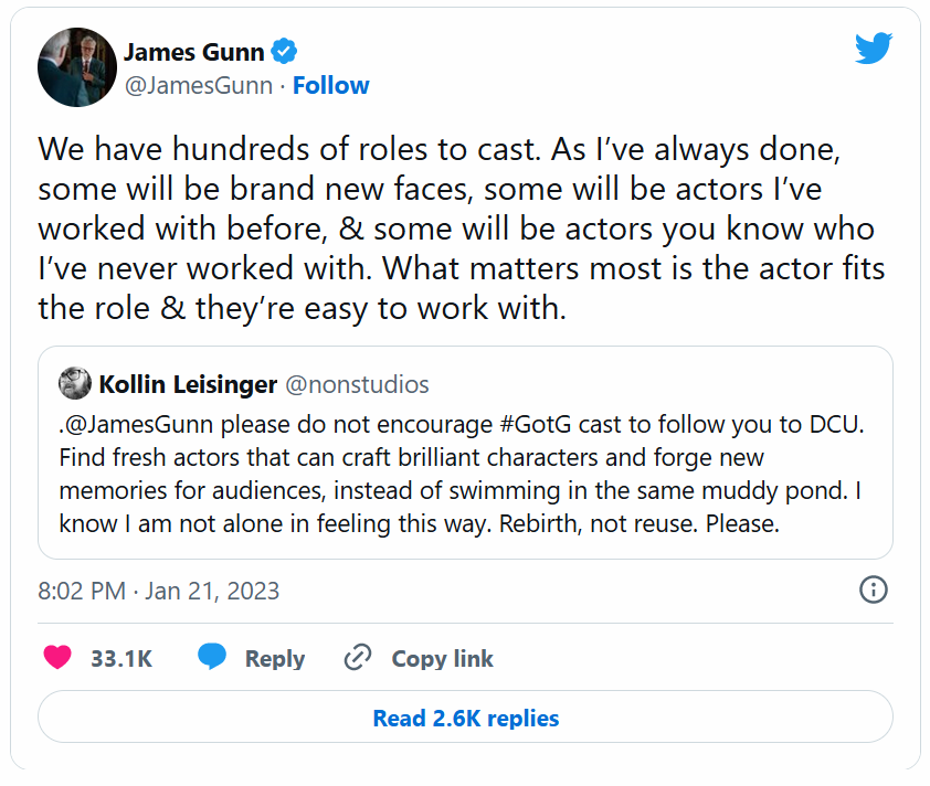 Plus tôt dans la semaine, nous vous avions déjà révélé que James Gunn envisageait de reprendre des membres du casting de la saga Les Gardiens de la Galaxie de Marvel Studios pour ses futurs projets au sein du DCEU. Une décision qui ne semble pas être au goût de tous les fans de DC Studios, en témoigne ce commentaire que l'on peut retrouver sur Twitter :