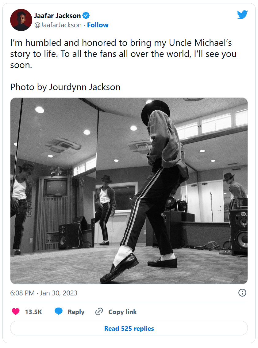 Si on savait que la famille de Michael Jackson était régulièrement consultée pour développer son biopic, on ne s'attendait tout de même pas à ce que ce soit l'un de ses membres qui l'incarne à l'écran. Et pourtant ! Son neveu, Jaafar Jackson, âgé de 26 ans, a annoncé la nouvelle sur ses réseaux sociaux : c'est lui qui interprétera son oncle dans le biopic qui lui sera dédié. Ce premier tweet publié par le jeune homme depuis un an et demi est également accompagné de ce qu'on imagine être une première photo de tournage, et il faut bien dire que la ressemblance avec Michael Jackson est frappante !
