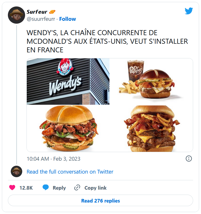 En 2022, la restauration rapide représentait 37% des restaurants implantés en France, Mc Donald's étant numéro 1 avec quelques 4,858 milliards d'euros de chiffre d'affaires et 1495 restaurants. C'est donc un sacré challenge pour n'importe quelle enseigne de fast food qui souhaiterait lui faire de l'ombre ! Ce pari, c'est Wendy's, une chaîne qui compte plus de 7 000 restaurants aux États-Unis et dans le monde, qui compte le relever. Absente en Europe, où elle a subi plusieurs échecs commerciaux, elle a décidé de ré-attaquer le marché du Vieux Continent, armée d'une nouvelle stratégie de développement international. Depuis 2021, elle s'est déjà déployée au Royaume-Uni, et veut désormais s'attaquer à la France, comme l'ont rapporté nos confrères de BFM Business, qui ont pu s'entretenir avec l'entreprise.