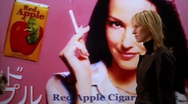 L'univers cinématographique de Tarantino est bourré de marques fictives. Des cigarettes aux chaînes de fast-food en passant par les compagnies de transport, elles contribuent à ancrer ses histoires dans la réalité et participent à critiquer une fois de plus notre obsession pour la consommation. Citons l'iconique marque de cigarettes "Red Apple", qui a été imaginée dans Pulp Fiction, puis reprise dans Boulevard de la Mort, quand Abernathy (Rosario Dawson) demande à Kim (Tracie Thoms) de lui acheter un paquet de Red Apple, dans Kill Bill vol.1 (via deux panneaux publicitaires), ou dans Les 8 Salopards (le tabac que fume Minnie).