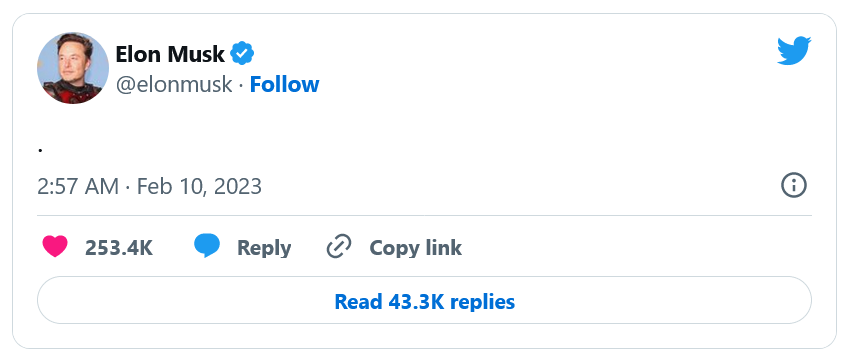 Un tweet que nous n'aurons pas besoin de traduire pour vous, puisqu'il ne contient qu'un simple point. Une manière de vérifier sa visibilité, une fois les employés responsables mis à la porte. Mais ce n'est pas la fin de cette histoire déjà absurde. Elon Musk aurait ensuite demandé à ses employés de comptabiliser le nombre de fois où ses tweets sont recommandés aux utilisateurs du réseau social. Un nouvel échec puisque aucune preuve d'un ban n'a pu être trouvée. L'homme qui, il y a quelques mois prônait la liberté d'expression à tout prix semble avoir beaucoup de mal à accepter que lui-même, quelques mois après le rachat, ne soit plus un sujet tendance sur Twitter.