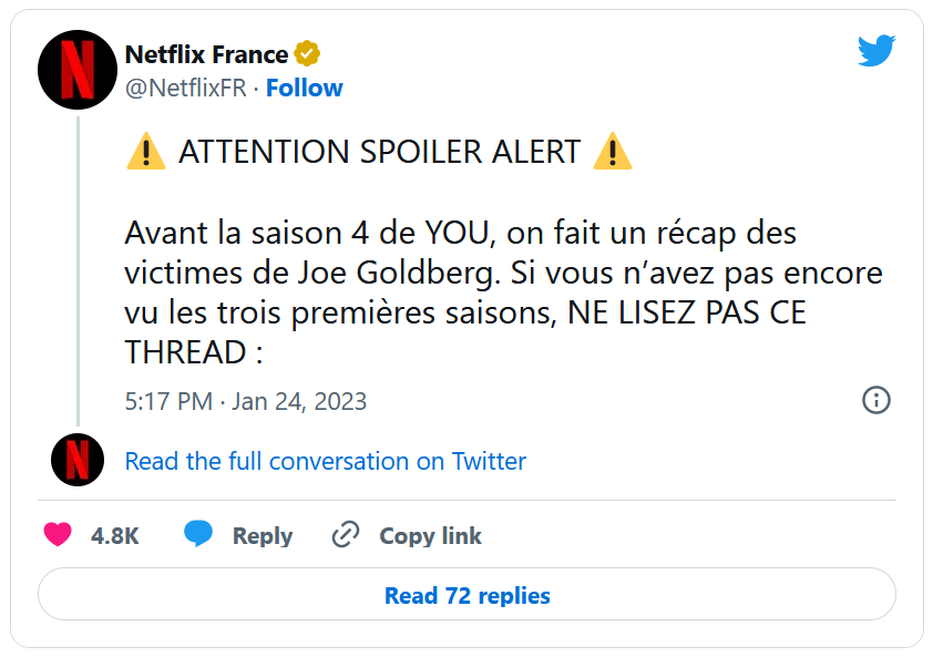 Cette théorie est née après la publication d'un post de Netflix France sur Twitter : la plateforme de streaming avait pris soin de noter le nom nom de toutes les victimes de Joe Goldberg, mais celui de Love n'est pas inscrit. Il y a peu de chances que l'entreprise au N rouge fasse une erreur pareille sans la rétablir dans la minute qui suit la publication ; voilà pourquoi les fans sont persuadés que le duel entre Love Quinn et Joe ne fait que commencer. À titre d'information, les cinq prochains épisodes de la saison 4 de You sont disponibles sur le catalogue. Les cinq autres sortiront le 9 mars 2023 sur Netflix.