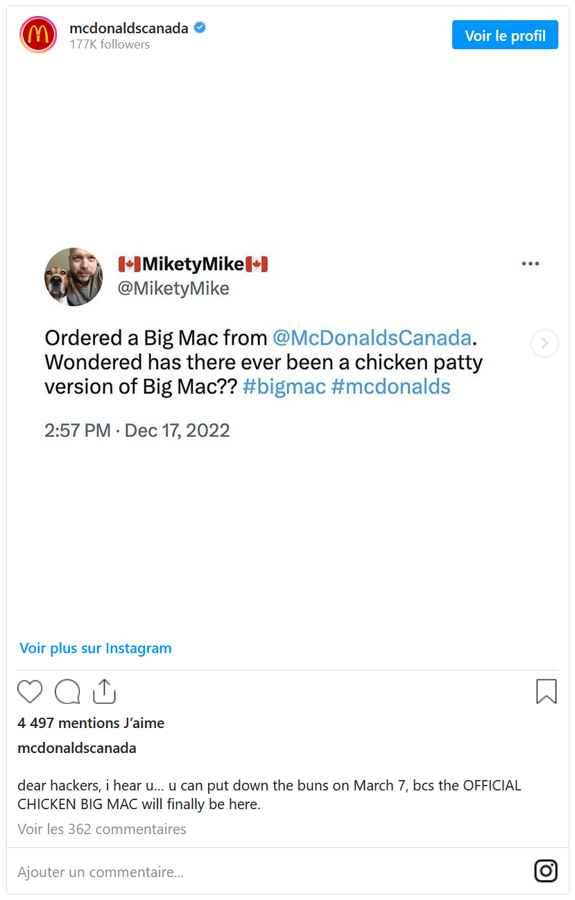 A part le steak remplacé par du poulet, rien ne change. Il s'agira toujours du même pain, ainsi que la même sauce inimitable pour le plus grand bonheur des fans. McDonald's Canada annonce en effet sur son compte Instagram le retour du Big Mac au poulet à partir du 7 mars. Néanmoins, il ne sera disponible que pour une durée limitée. Alors, si vous vivez au Canada où que vous y allez pour des vacances, n'hésitez pas à faire un détour pour goûter ce délicieux sandwich.