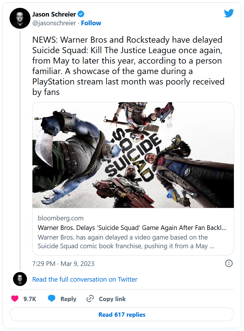 S'il ne précise pas que ce report est lié à la déception de la communauté, on se doute qu'elle se conjugue avec le fait que Rocksteady compte peaufiner le jeu, notamment via la correction de bugs. De plus, le studio aimerait certainement éviter une sortie dans un calendrier déjà très chargé avec l'arrivée de must have comme Zelda Tears of the Kingdom dans la même période (12 mai) ou encore Final Fantasy 16 au mois de juin.