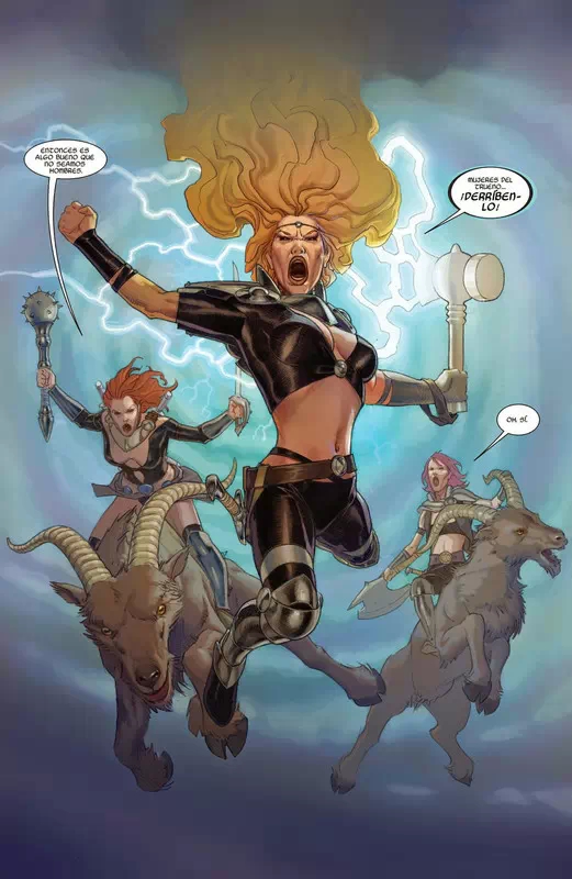 Dans Avengers #66, Jason Aaron et Javier Garron viennent de mettre en scène l'une des plus grosses guerres multiverselles. Ils ont en effet opposé les plus grands héros du multivers à une armée de Dr Fatalis et de Mephistos multiversaux. Une guerre violente a donc opposé les plus grands héros du continuum temporel aux variants de Fatalis et Mephisto. Durant la bataille finale, Thor a rencontré ses petites filles venues d'un avenir lointain. Sans surprise, les déesses du tonnerre Frigg, Atli et Ellisiv sont dignes de manier Mjolnir. Les lecteurs découvrent ainsi que la lignée de Thor n'est pas prête de s'éteindre et que ses descendants sont donc tout aussi dignes que lui.
