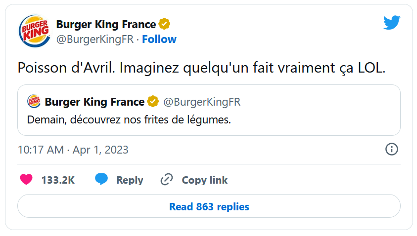 Cette année, Burger King a titillé quelque chose de spécial. Sur Twitter, le géant américain s'est préparé au conflit en publiant un premier tweet le 31 mars, indiquant qu'ils allaient révéler le lendemain leurs toutes nouvelles frites de légumes. Finalement aujourd'hui, ils se sont ravisés en indiquant ironiquement que non, sous-entendant que ce serait vraiment une mauvaise idée. C'est un tacle direct à McDonald's sur ses récentes frites de légumes, qui ont remplacé les potatoes.