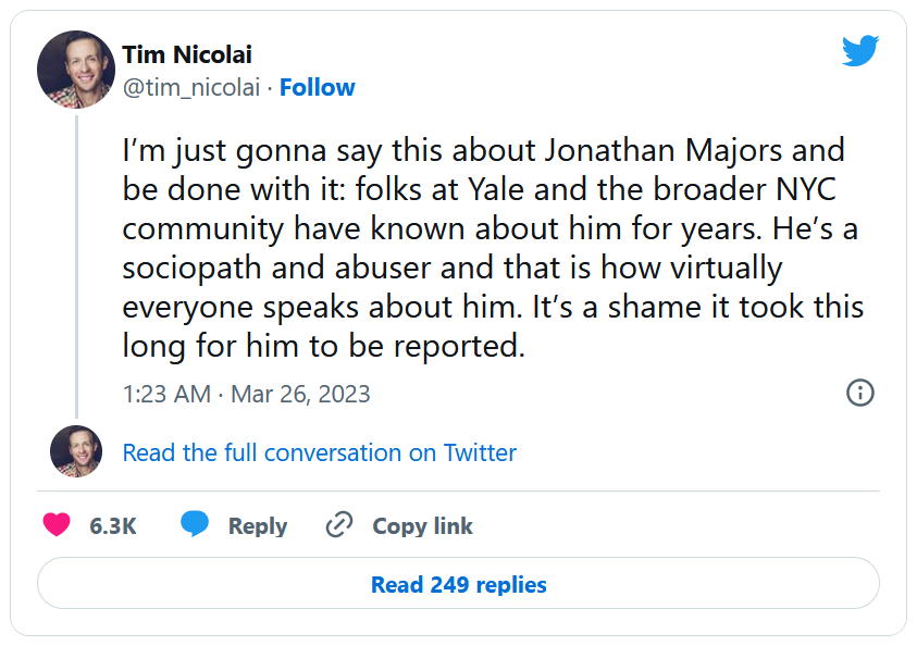 Enfin, une autre personnalité d'Hollywood n'a pas hésité à dégommer l'acteur sur Twitter aussi en réagissant à l'affaire Jonathan Majors. L'acteur et réalisateur Tim Nicolai qui travaille pour CBS, Amazon et HBO a affirmé que de nombreuses personnes qui le connaissent depuis des années parlent de l'acteur comme étant "un sociopathe et un abuseur" et regrette "qu'il ait fallu autant de temps pour qu'il soit dénoncé".