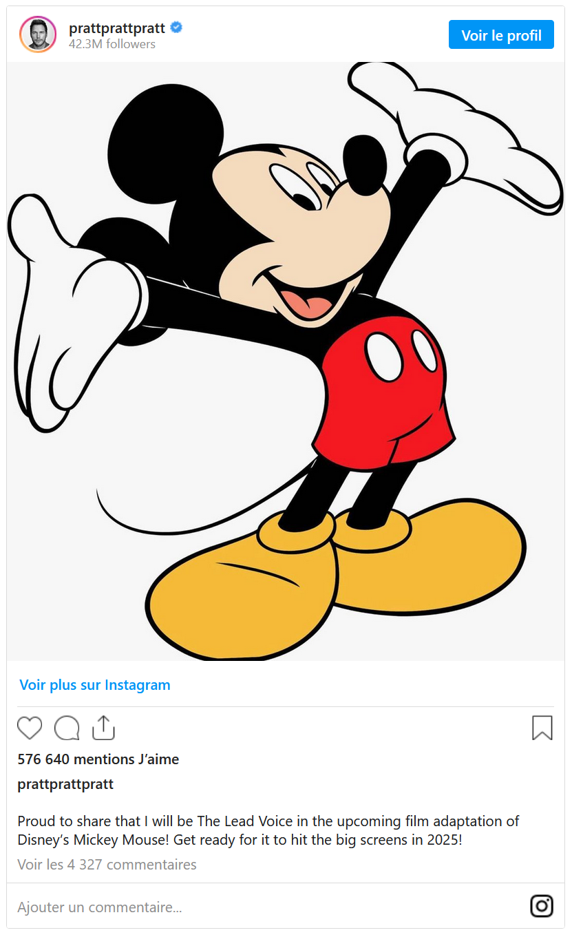 Je suis fier de partager avec vous que je serai la voix principale du prochain film d'animation Mickey Mouse ! Soyez prêts pour sa sortie sur grands écrans en 2025 !