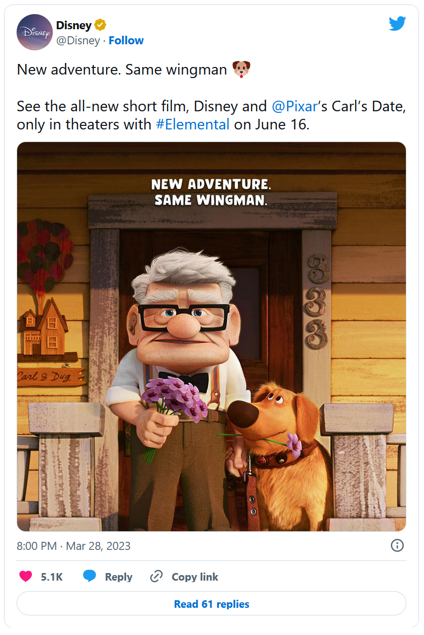 Si Elementaire de Peter Sohn promet d'être plein de surprises, il ne faudra pas attendre le début du film pour être émerveillé. Et pour cause, comme cela a été fait en 2018 avec Bao, un court-métrage projeté en première partie des Indestructibles 2, Disney va offrir une suite de l'un des films d'animation préférés par les fans du genre : Là-haut. Carl's date sera dévoilé juste avant la diffusion de Elementaire sur grand écran. Vous vous rappelez certainement de Carl Fredricksen, un vieil homme ronchon et déprimé depuis la mort de sa femme. Lorsqu'il rencontre Russell, un garçon de 8 ans, puis Doug, un chien avec un collier spécial ou encore Kevin, un oiseau incapable de voler, Carl va se rendre compte que les plus grandes aventures de la vie ne sont pas celles qu'on croit.