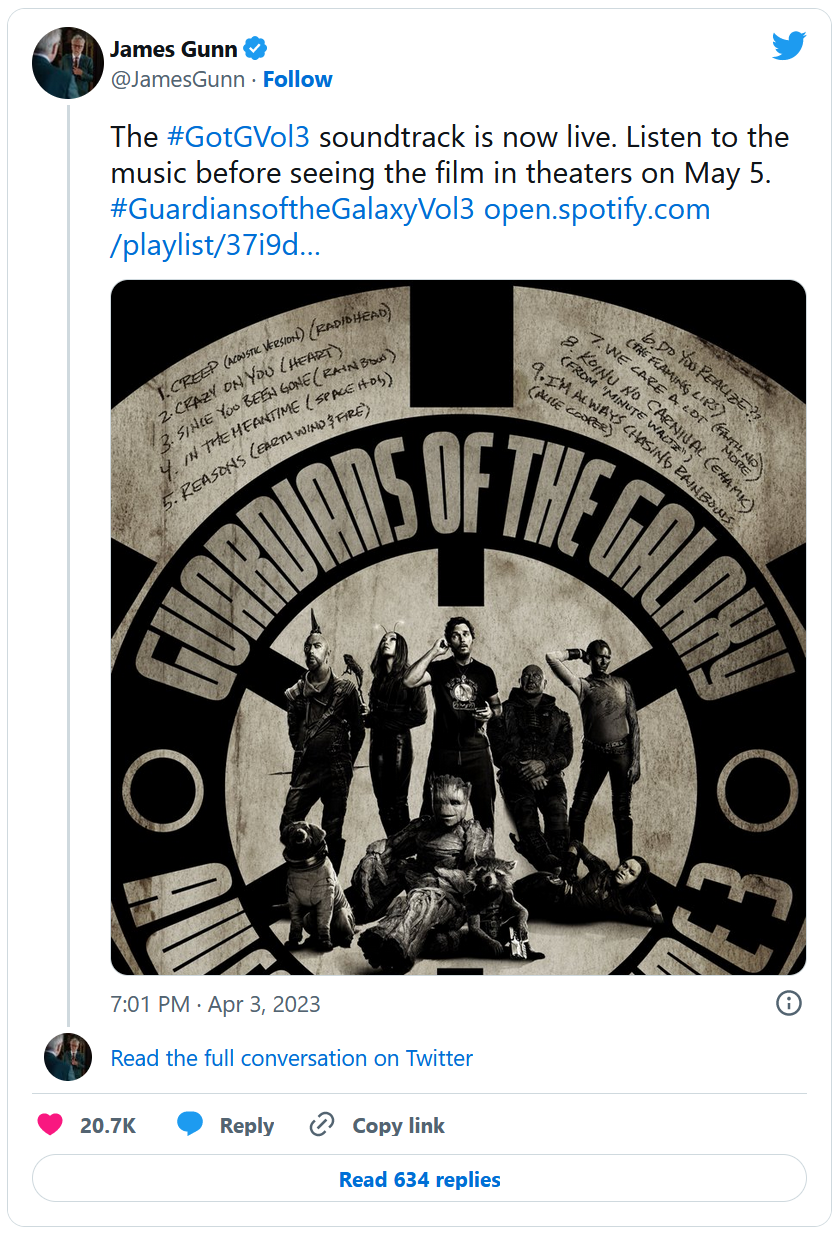 On a ainsi appris l'intégration de nouveaux personnages (le Maître de l'évolution, Adam Warlock), la durée du film, de 2 h et 29 minutes, soit le 4e film le plus long du MCU, ou encore que le passé mouvementé de Rocket sera au centre de l'intrigue. En plus de bandes-annonces et trailers toujours très nerveux, James Gunn n'hésite pas à faire monter la température en personne sur les réseaux et en particulier sur Twitter.