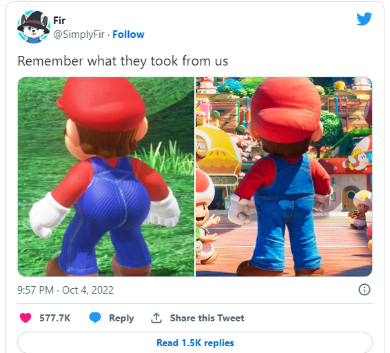 Lorsque les fans ont découvert les premières images de Super Mario Bros 2023, ils ont été choqué ! Le physique de Super Mario a été retouché. Ses fesses rebondies ont été remplacées par un derrière tout plat. "Souvenez-vous de ce qu'ils nous ont pris" a ainsi déploré un internaute, comparant les deux versions de Mario, dont le message a été "liké" plus de 570 000 fois.
