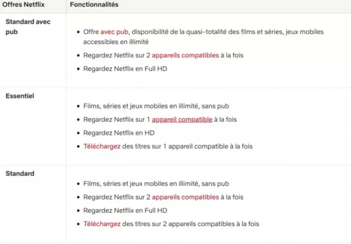Le prix reste le même. Alors qu'est-ce qui change ? En plus du nom de l'abonnement, désormais, vous pouvez regarder les vidéos en résolution Full HD et utiliser la plateforme sur deux appareils en même temps. Une offre qui, au passage se rapproche davantage de l'offre Standard à 13,49 euros par mois plutôt que l'offre Essentiel à 8,99 euros.