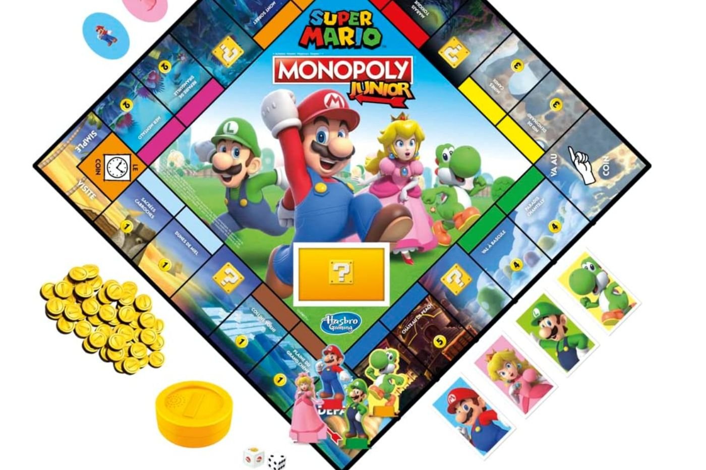 Les pions sont évidemment à l'effigie de symboles issus de cet univers, on retrouve donc une carapace, une étoile et même un champignon. Ceux-ci s'utilisent également à la place des maisons pour signifier un achat. Que serait un jeu financier Mario sans petites pièces jaunes ? Pour cette version, n'espérez pas retrouver des hôtels, elle se base sur le jeu Monopoly Junior, et est donc accessible aux enfants dès 8 ans.