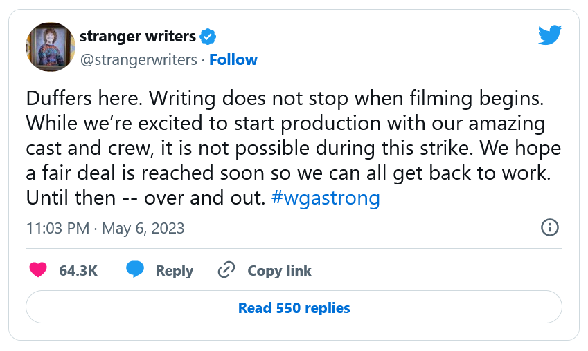 Ici les frères Duffers. L'écriture ne s'arrête pas au début du tournage. Bien que nous soyons ravis de commencer la production avec nos incroyables acteurs et toute l'équipe, ce n'est pas possible pendant cette grève. Nous espérons qu'un accord équitable sera bientôt conclu afin que nous puissions tous retourner au travail. Jusque là, [la grève continuera] encore et encore.